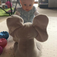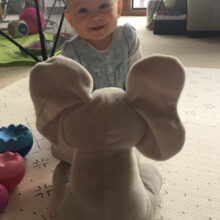 It was gifted to my almost 4-month-old son for Christmas this year. The voice of the elephant is very sweet and not annoying like some toys. It is a loud volume and piques the baby’s interest. The ears cover the eyes and pass for a second before opening up. I like that it has buttons on the feet for singing or playing. It is crazy soft. So soft I almost dropped it a couple of times lol.